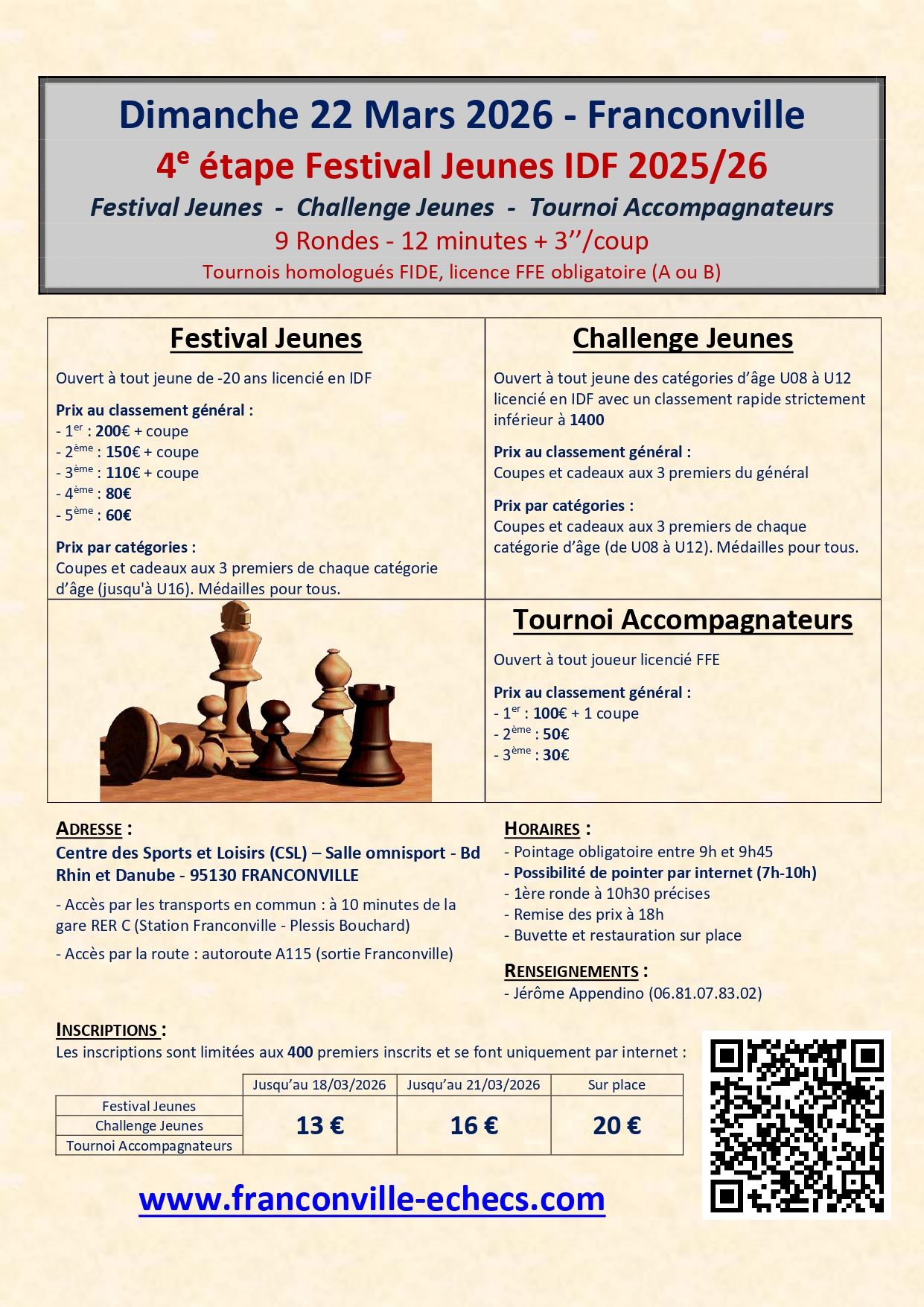 Le 24e tournoi Rapide FIDE aura lieu le vendredi 13 mars 2026 à partir de 20h30 au club de Franconville.